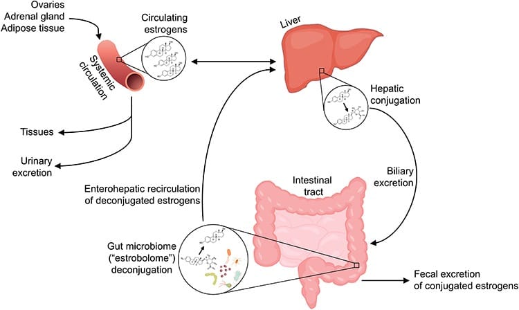 Your liver packages used estrogen into an inactive, conjugated kind after which sends it to your intestine with bile. Most of it’s eradicated within the stool. Nonetheless, the secreted beta-glucuronidase enzyme from the estrobolome deconjugates a number of the estrogen, permitting it to be reabsorbed from the intestine again into circulation.