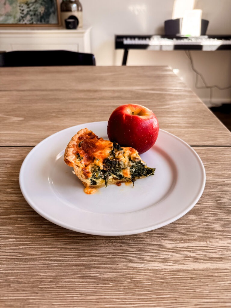 I labored straight via the morning and had lunch round 12:30. Leftover quiche and an apple. The oatmeal stuffed me up fairly nicely, so I wasn’t terribly hungry.